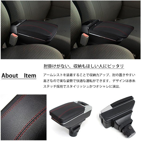 脱着式の灰皿も搭載し、利便性の高いアームレスト&コンソールボックスです!仕様(スペック)カラー:ブラック、メッキ、レッドステッチサイズ:W130×H200(取付時)×D320 【セット内容】本体付属品:スライドストッパー×2、取付ねじ×12 ※取扱説明書は付属しておりません。